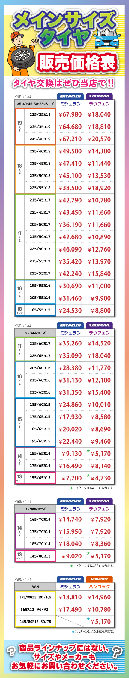 当店では、地域最安値帯の価格でタイヤ交換・取付を実施しています。